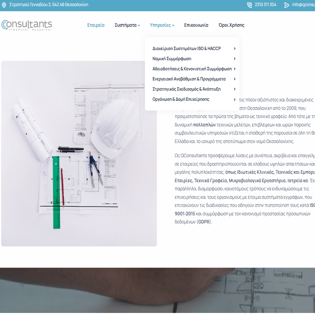 Η QConsultants είναι μια έμπιστη εταιρεία συμβούλων μηχανικών με έδρα τη Θεσσαλονίκη, που δραστηριοποιείται από το 2009 στην παροχή ολοκληρωμένων τεχνικών λύσεων — από την εκπόνηση μελετών και την επίβλεψη έργων μέχρι τη διαχείριση συστημάτων ISO/HACCP, νομική συμμόρφωση (όπως GDPR) και ενεργειακές μελέτες — καλύπτοντας μια ευρεία γκάμα υπηρεσιών για επιχειρήσεις υψηλών απαιτήσεων και πολυπλοκότητας.